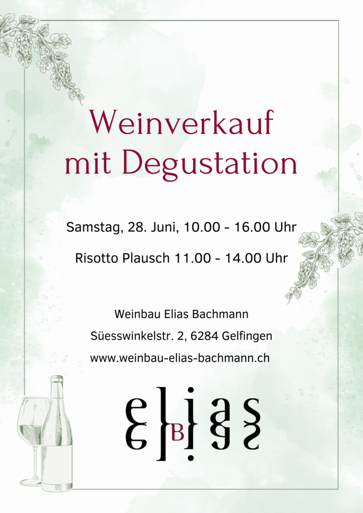 28. Juni 2025 Weinverkauf mit Degustation 27. Mai 2025Kategorie: Angebote Wir freuen uns Sie auf unserem Hof an der Süesswinkelstrasse 2 in Gelfingen zum Weinverkauf mit Degustation und Risottoplausch begrüssen zu dürfen.